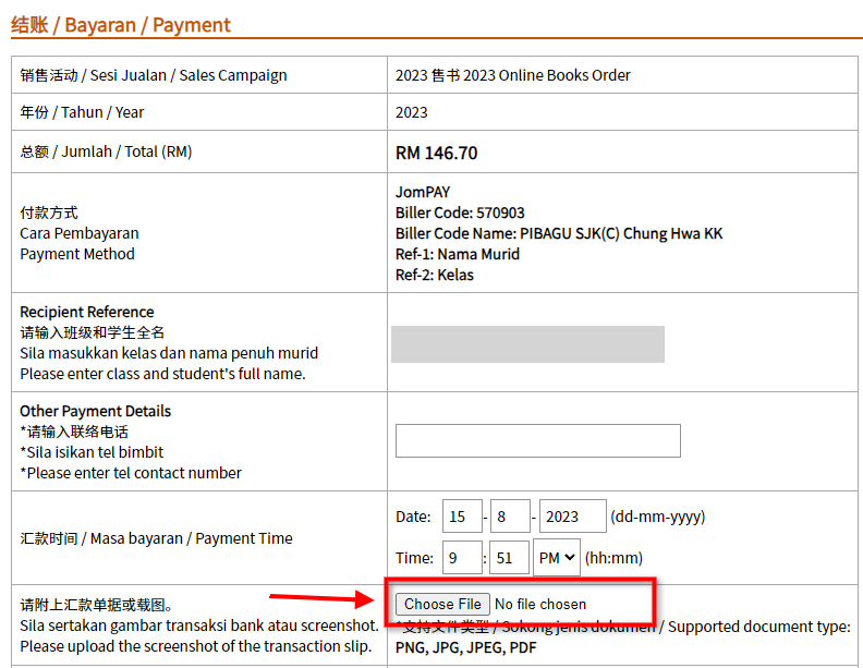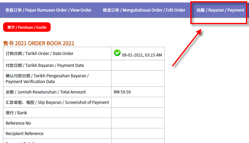 Sertakan resit (gambar, screenshot) transaksi tersebut ke dalam sistem.