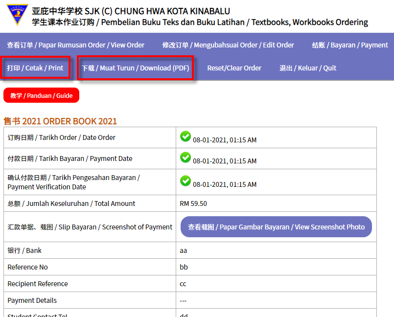 Akhirnya, anda boleh [Cetak] atau [Muat Turun] penyata pembelian.